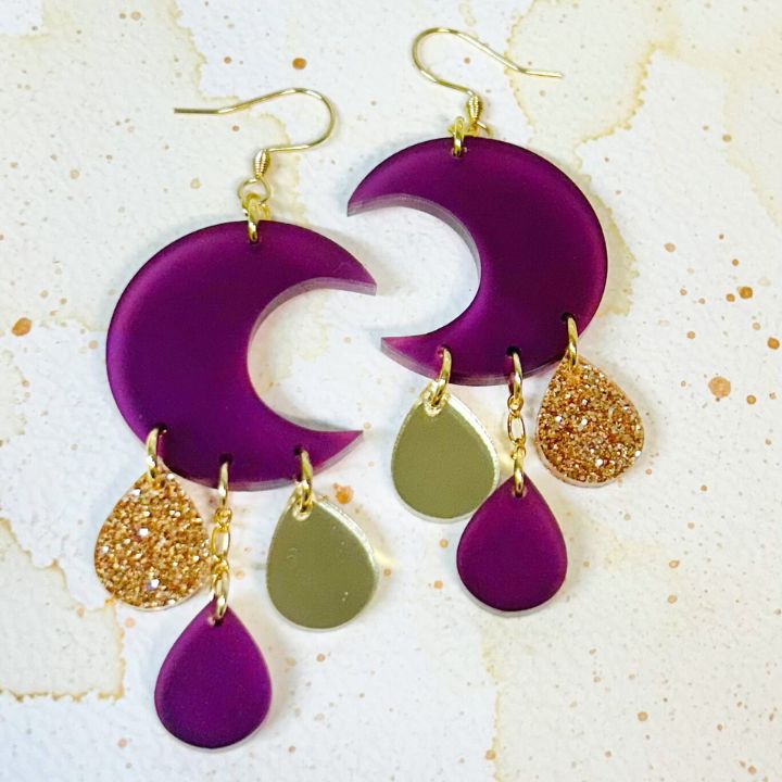 Kuu ja pisara mattaista huurre akryyliä ja pisaroissa lisänä kullan sävyistä peili- ja glitterakryyliä. Korvakorukoukut ja renkaat 24K kullattua kirurginterästä (RST 304), pieni ketju nikkelivapaa.