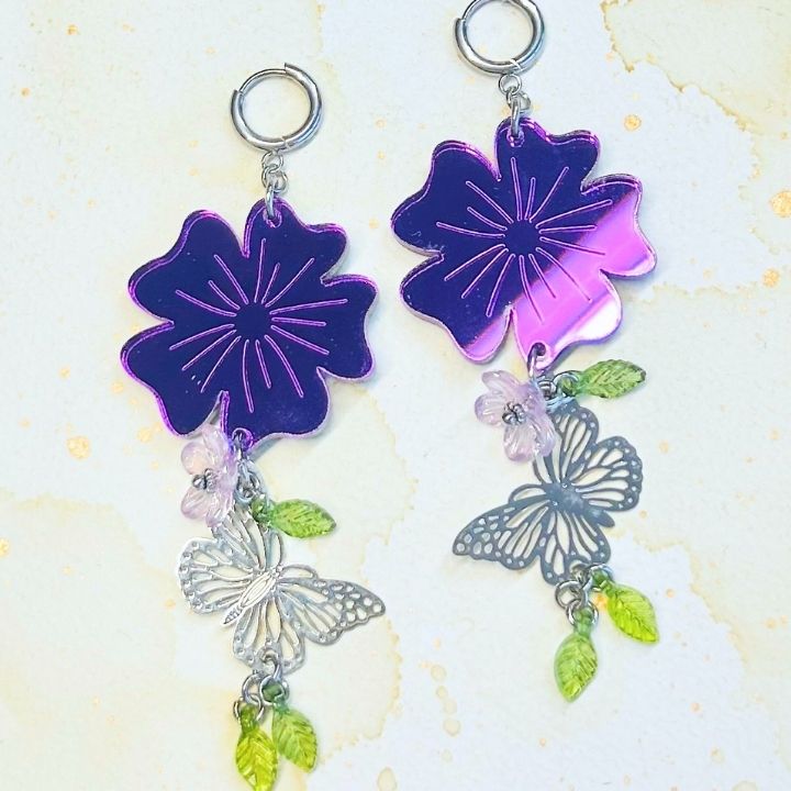 Viola iso, upeasti välkehtivää violetin sävyistä peili akryyliä, yhdistettynä vihreisiin lehtiin ja pieneen kukkaan (akryyliä). Perhonen teräksen sävyinen ohut metalli riipus, nikkelitön. Korvakorurenkaat 12mm, PVD kirurginterästä (rst 304). Välirenkaat kirurginterästä (rst 304).