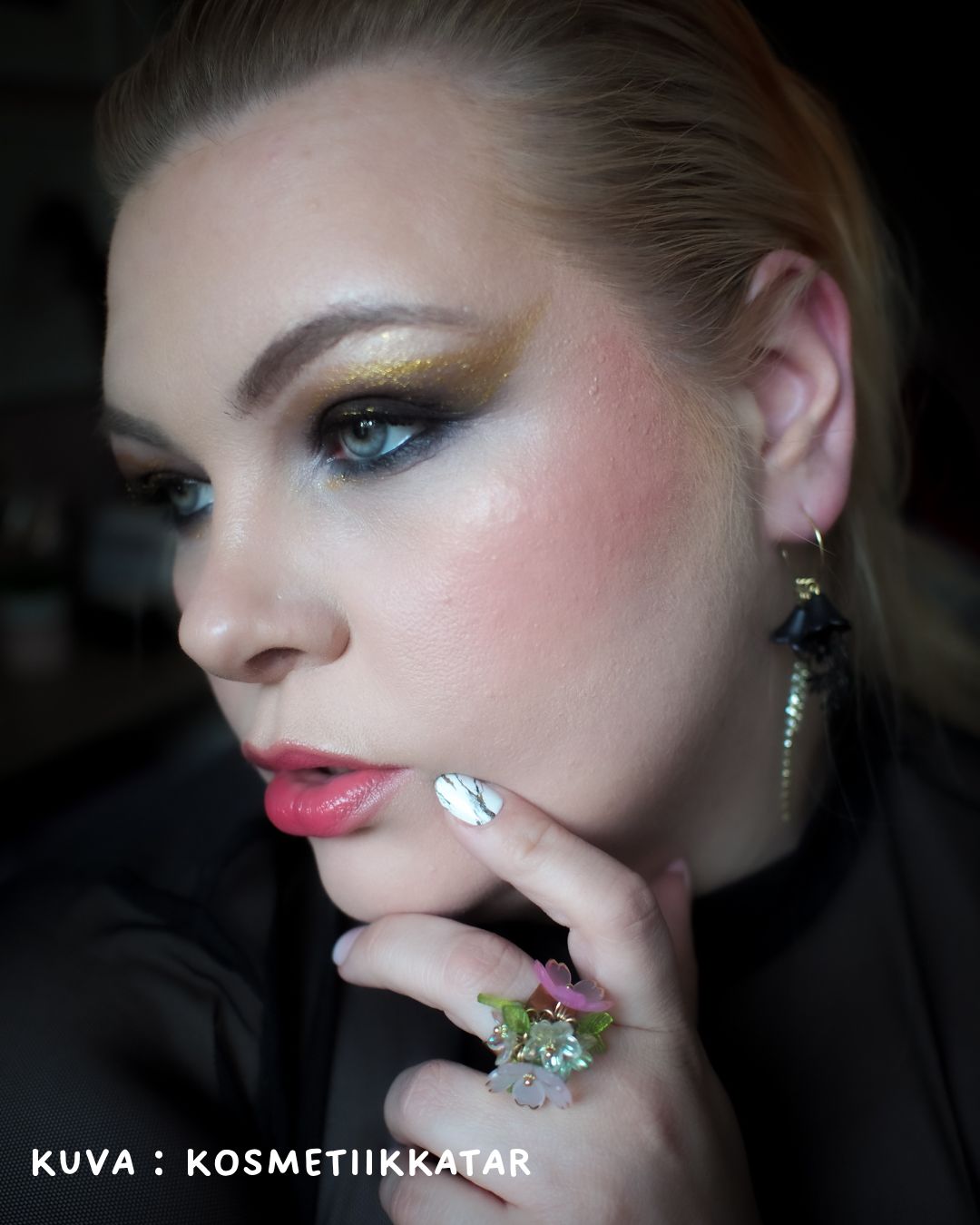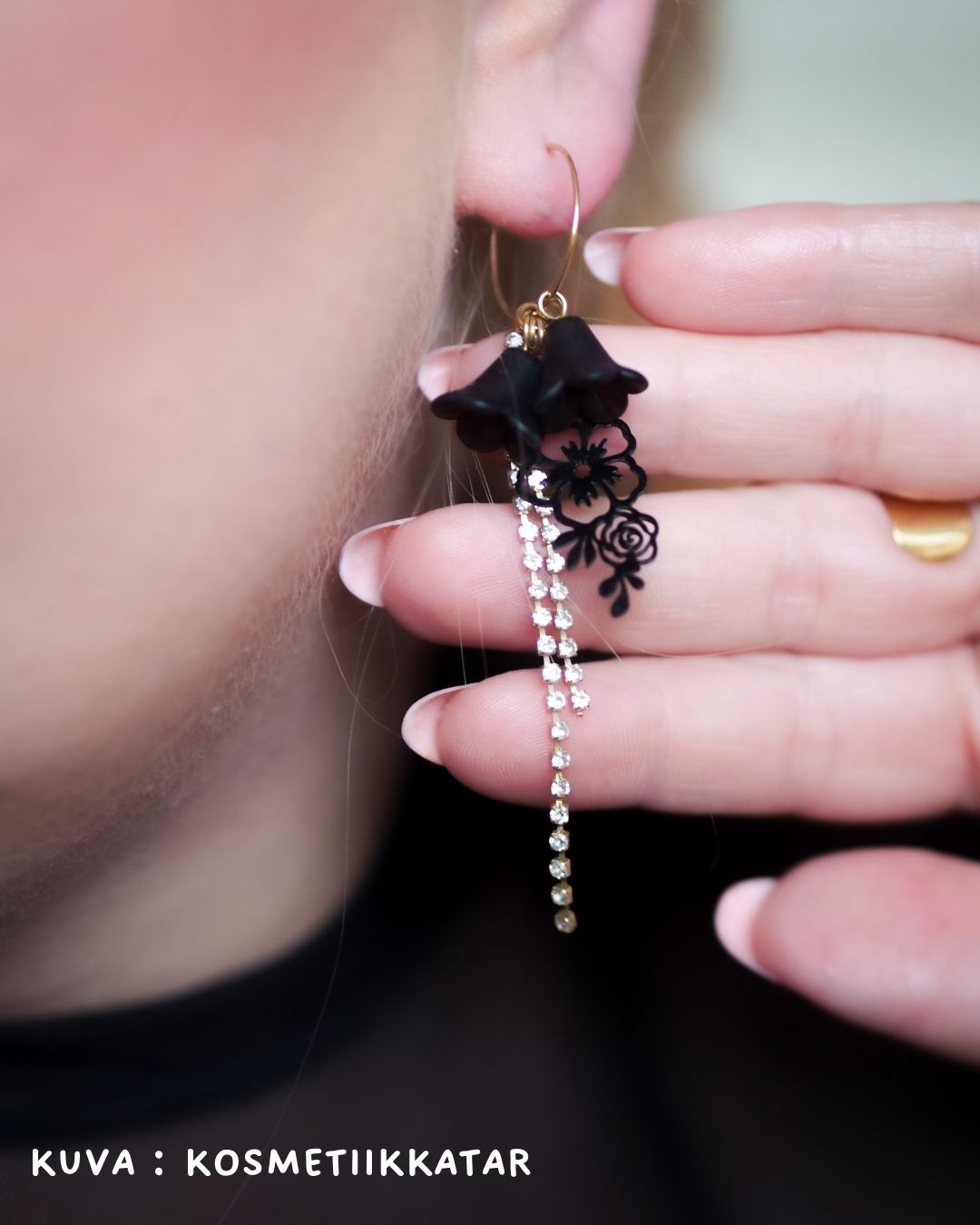 Kosmetiikkatar ja yllä Yökellot-korvakorut. Sormus on Kukkatarha-sarjan sormus.